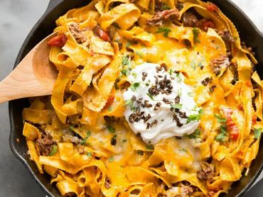 Ground beef, tomatoes, egg noodles tossed in a creamy sour cream sauce and topped with a blend of Mozzarella, Parmesan, and yellow cheese.